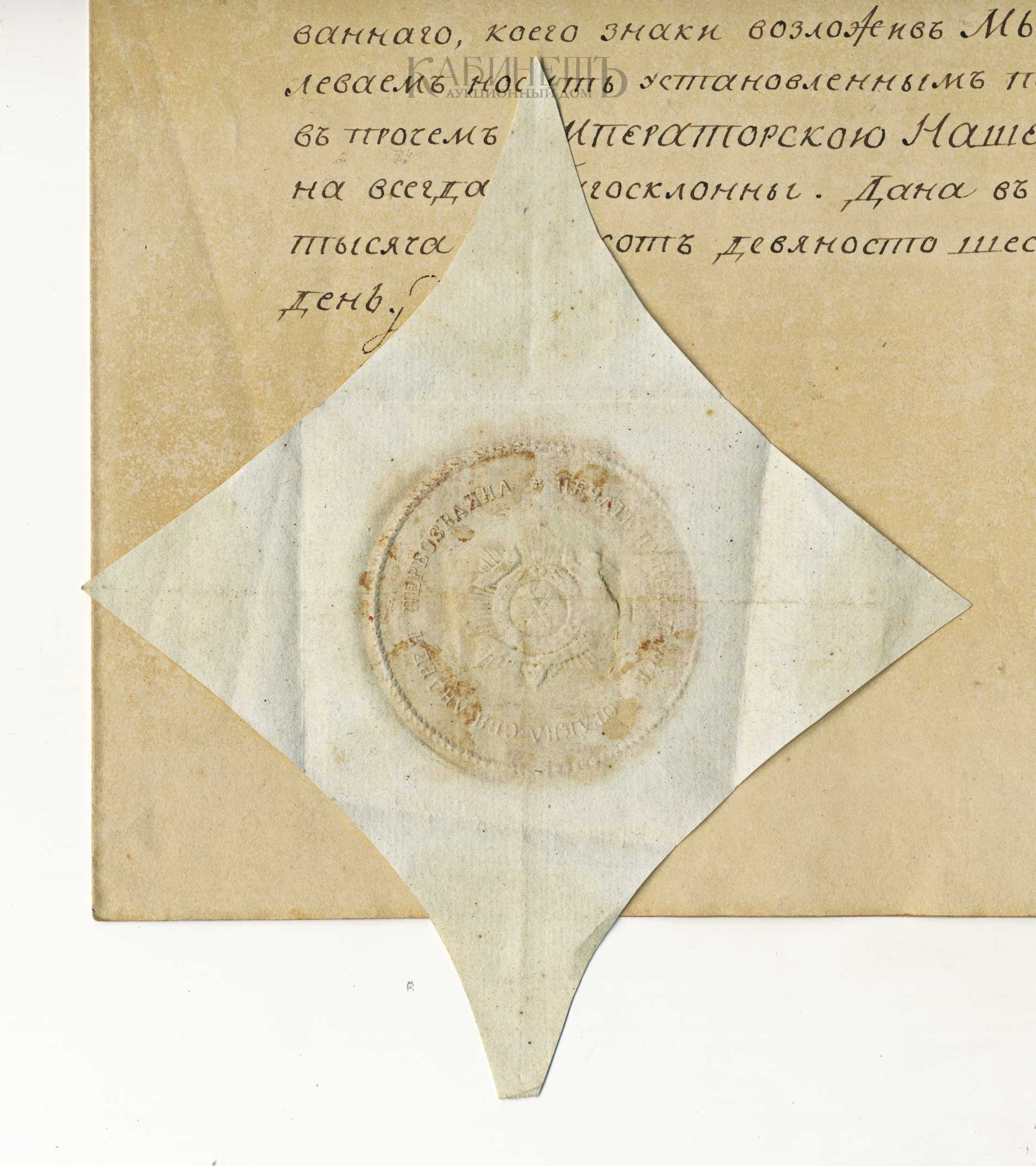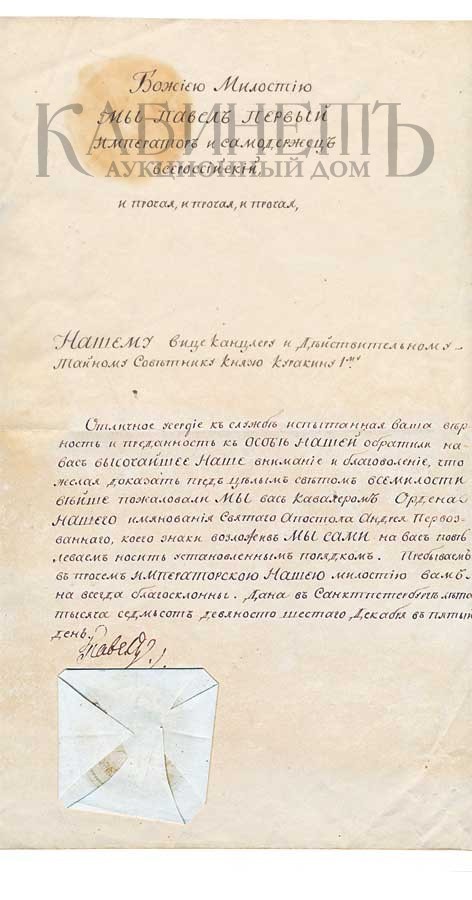 Нашему вице канцлеру и Дъйствительному/ Тайному Советнику Князю Куракину 1му./ Отличное усердiе къ службъ испытанная ваша въ-/ рность и преданность къ Особъ Нашей обратили на/васъ высочайшее Наше вниманiе и благоволенiе, что/ желая доказать предъ цълым свътомъ всемилости-/ въйше пожаловали Мы васъ Кавалеромъ Ордена/ Нашего имянованiя Святого Апостола Андрея Первоз-/ ванного, коего знаки возложивъ Мы Сами на васъ повъ-/ леваемъ носить установленнымъ порядкомъ. Пребываемъ/ въ прочемъ Императорскою Нашею милостiю вамъ/ на всегда благосклонны. Дана въ Санктпетербурге лъта/ тысяча седмьсотъ девяносто шестого Декабря в пятый/ день.