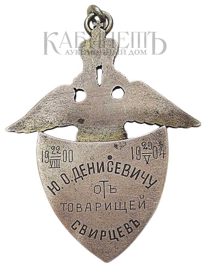 На оборотной стороне надпись: «22.8.1900/ 29.5.1904/ Ю.О. Денисевичу/ отъ/ товарищей/ СВИРЦЕВЪ». Очень редкий.