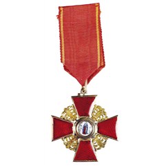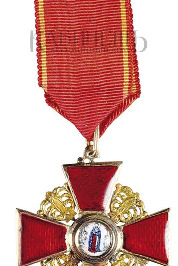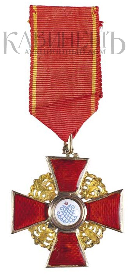 Клейма: на оборотной стороне на ушке – пробирное «56» с женской головкой в кокошнике, повернутой вправо, с буквой «альфа»; на верхнем луче под эмалью – именник «ВД»; на нижнем – развернутое клеймо «Эдуардъ».