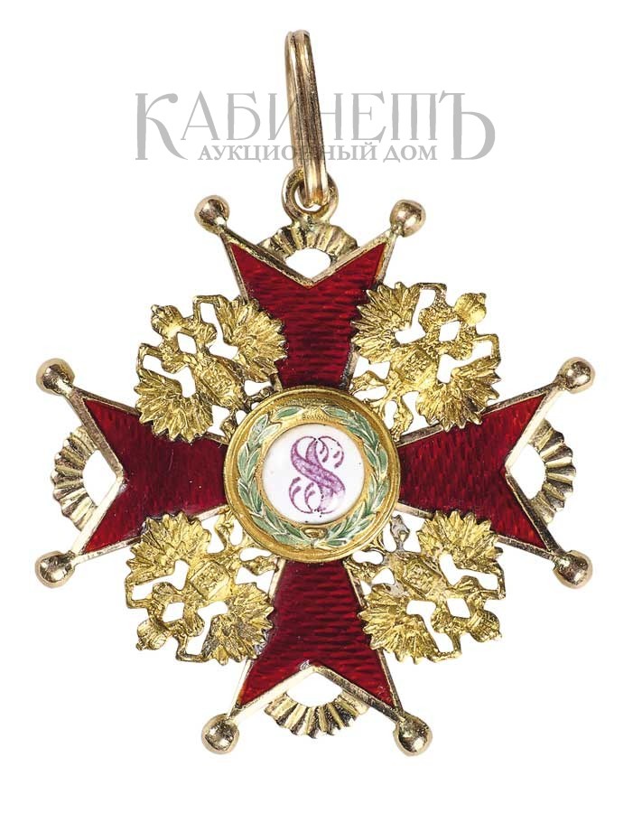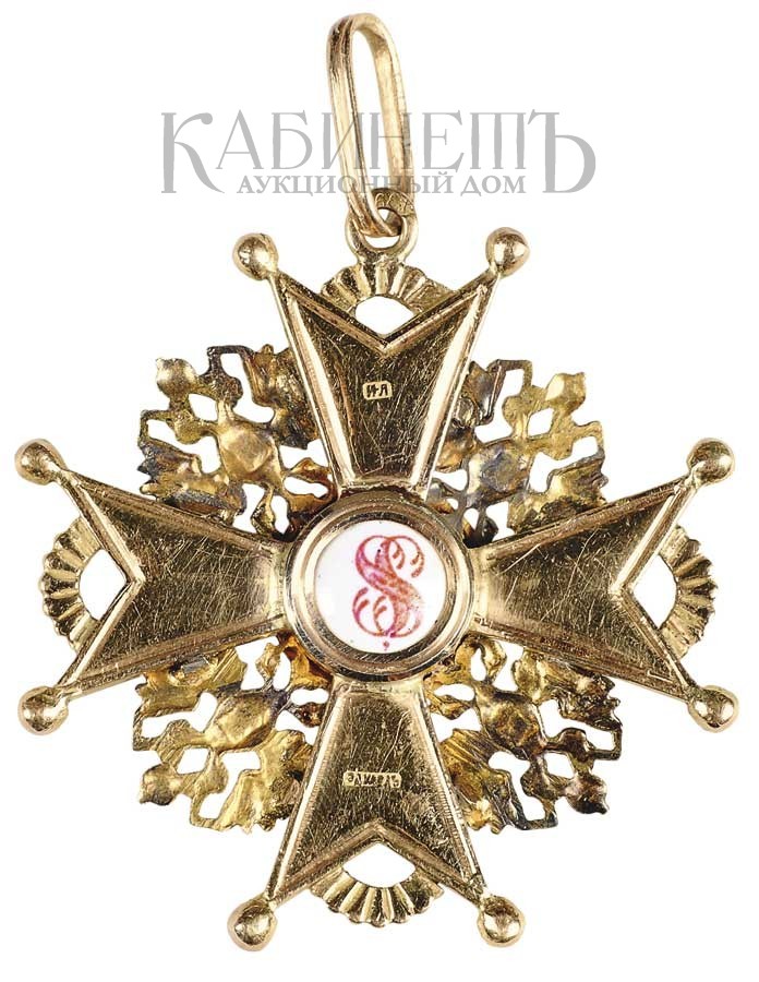 Клейма: на оборотной стороне на ушке – пробирное «56» Санкт-Петербургского окружного пробирного управления, с женской головкой в кокошнике, повернутой влево, с инициалами пробирного инспектора«АР»; на верхнем луче – именник «ИЛ», на нижнем – развернутое клеймо «Эдуардъ».
