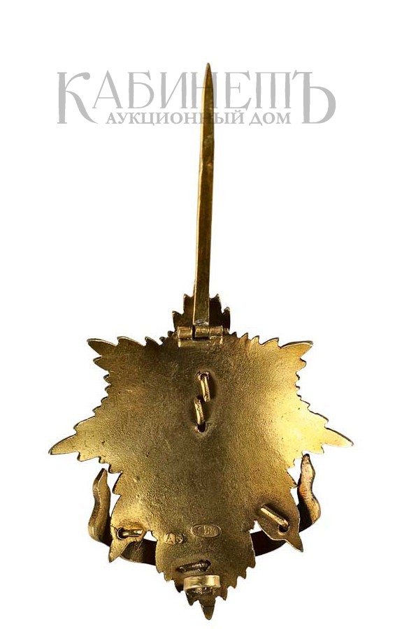 Клейма: на оборотной стороне – пробирное «84» Санкт-Петербургского окружного пробирного управления, с женской головкой в кокошнике, повернутой вправо, с буквой «альфа»; именник «АБ».
