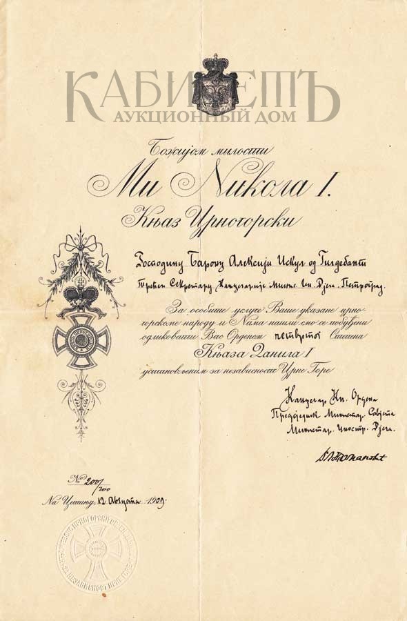 142. 6. Грамота № 200/200 от 12 августа 1909 года о пожаловании третьего секретаря канцелярии Министерства Иностранных Дел барона Икскуль фон Гильденбанда орденом Данило I, с сургучным оттиском печати ордена Данила I