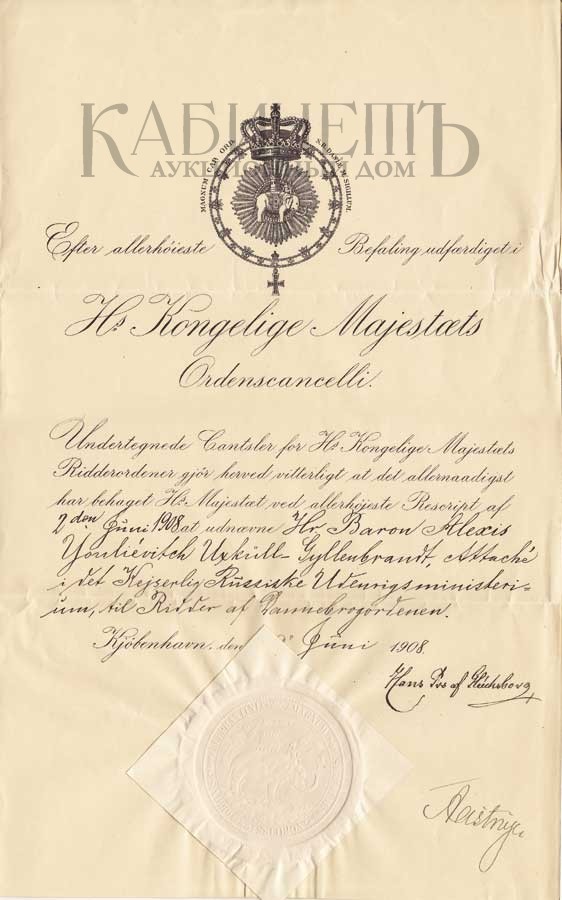 142. 4. Грамота от 9 июня 1908 г. о пожаловании барона Алексея Юльевича Икскуль фон Гильденбанда орденом Данеброга, с оттиском печати ордена Данеброга.