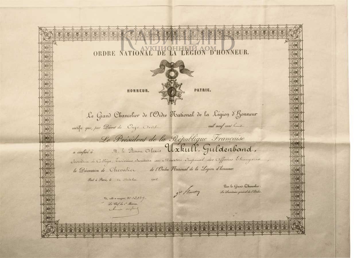 142. 3. Грамота № 13049 от 24 октября 1908 г. о пожаловании барона Алексея Икскуль фон Гильденбанда орденом Почетного легиона и членский билет Общества Кавалеров ордена Почетного легиона