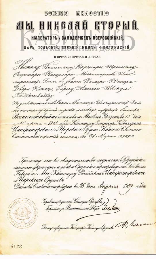 142. 2. Грамота № 4133 от 25 апреля 1909 г. о пожаловании коллежского секретаря, третьего секретаря канцелярии Министерства Иностранных дел, Камер-юнкера Двора, барона Алексея Икскуль фон Гильденбанда орденом Святого Станислава 3-й степени, с оттиском печати ордена Святого Станислава
