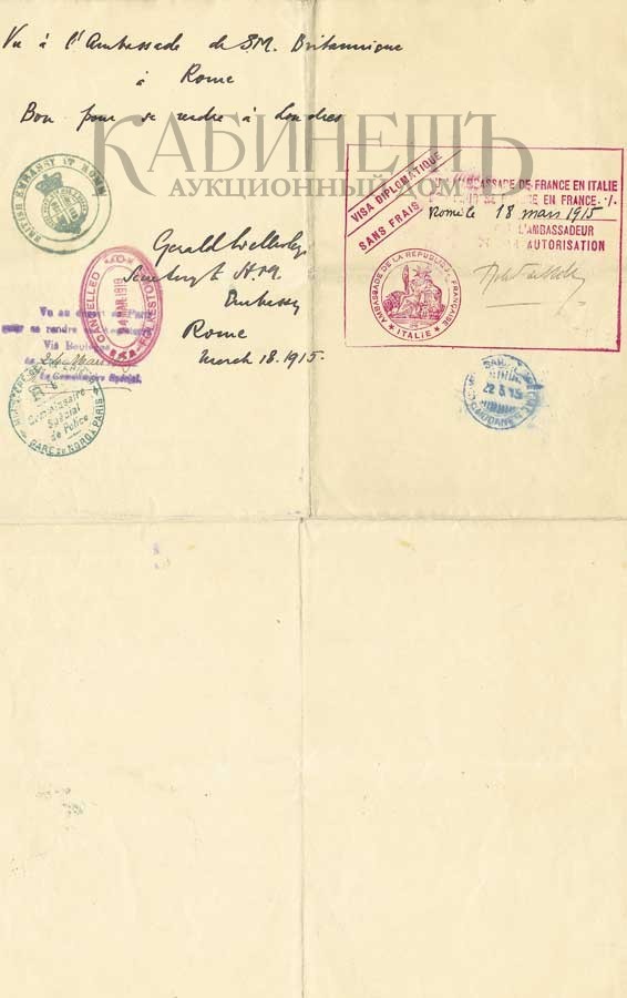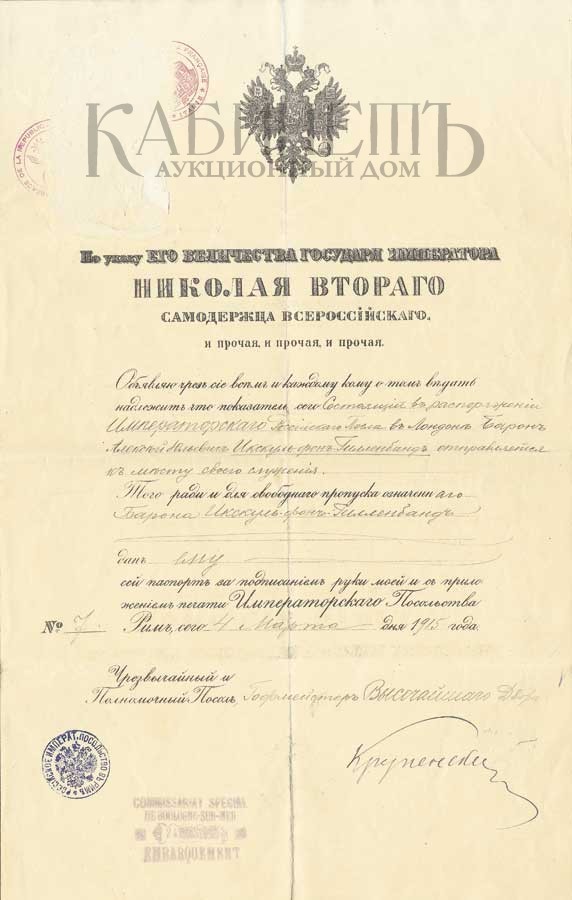 Дипломатический паспорт № 7 от 4 марта 1915 г. на имя барона Алексея Юльевича Икскуль фон Гильденбанда, состоящего в распоряжении Императорского Российского Посла в Лондоне