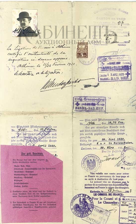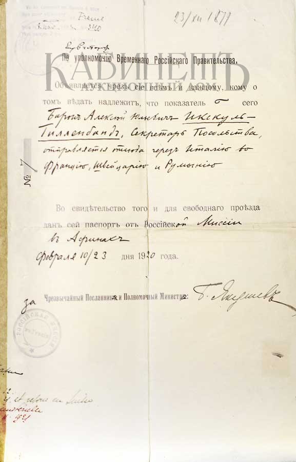 Дипломатический паспорт № 7 от 23 февраля 1920 г. на имя секретаря российского посольства в Греции барона Икскуль фон Гильденбанда