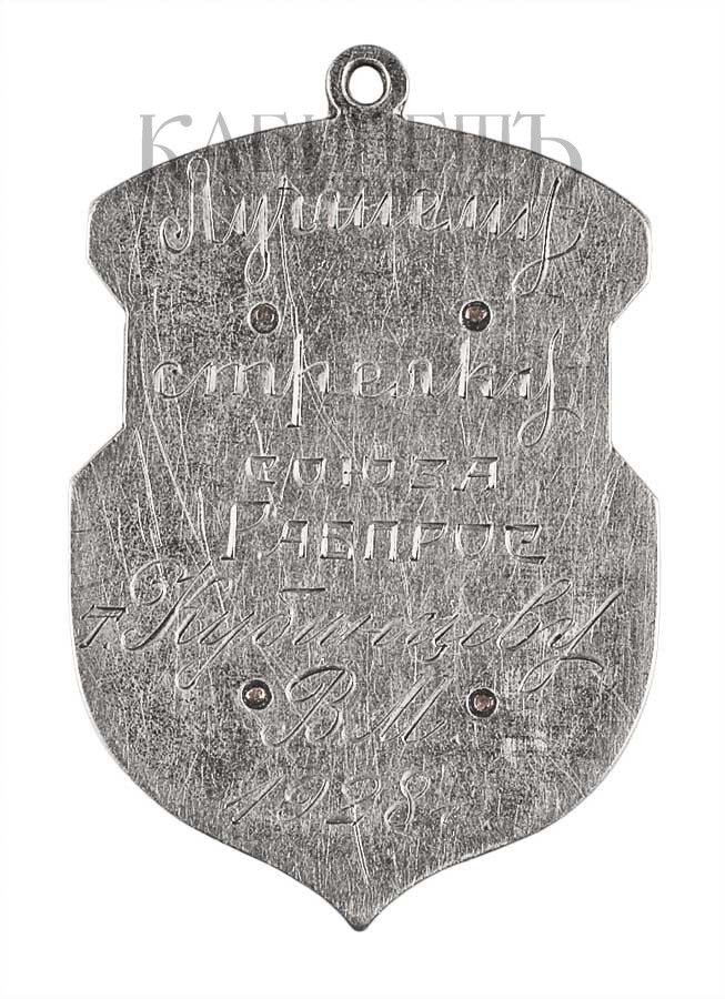 На оборотной стороне – гравированная надпись:«Лучшему/ стрелку / союза/ Рабпрос/ т. Кубинцеву/ В.М./ 1928 г.»