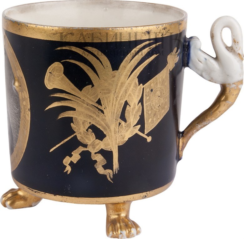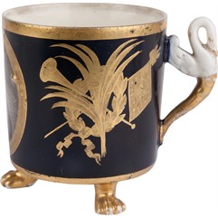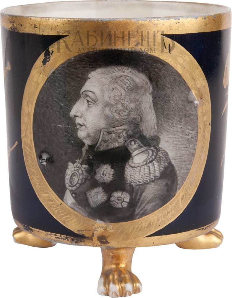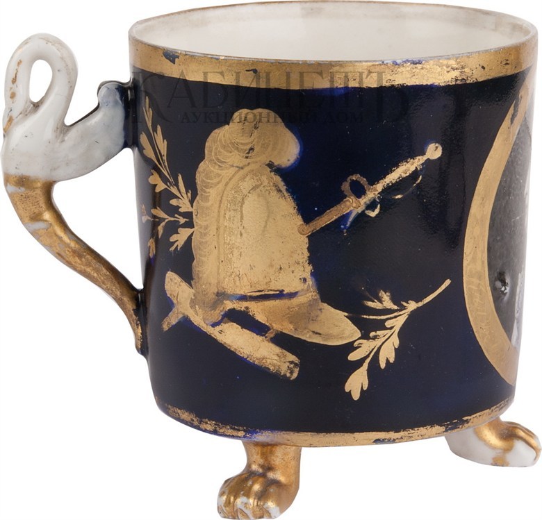 Российская империя, Частный фарфоровый завод. Первая половина XIX в. Размер: 7,3 х 6,7 см Фарфор, кобальтовое крытье, подглазурная роспись, цировка по золоту. Реставрирована.