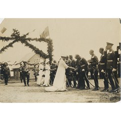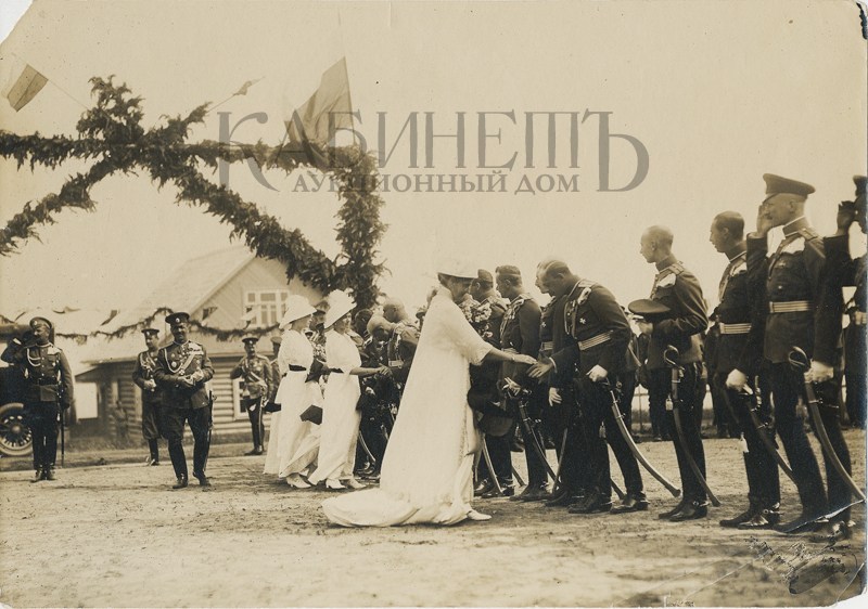 Императрица Александра Федоровна с дочерьми приветствует офицеров лейб-гвардии Уланского Ее Величества полка на освящении церкви Иоанна Воина в летнем лагере лейб-гвардии Уланского Ее Величества полка близ деревни Куттузи, неподалеку от Красного Села 22 июня 1914 г.