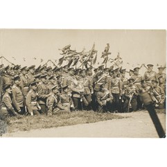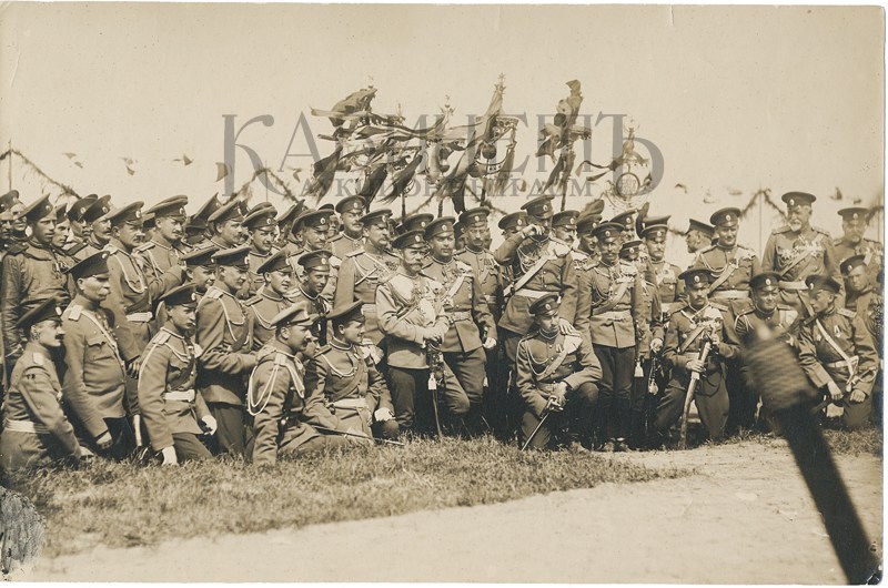 Император Николай II в окружении офицеров полков на освящении церкви Иоанна Воина в летнем лагере лейб-гвардии Уланского Ее Величества полка близ деревни Куттузи, недалеко от Красного Села, во время торжеств при освящении полковой церкви Иоанна Воина 22 июня 1914 г.