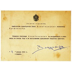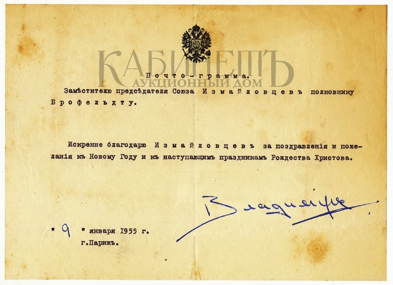 Почтограмма великого князя Владимира Кирилловича заместителю председателя Союза Измайловцев полковнику Б.М. Брофельдту от 9 января 1955 г.