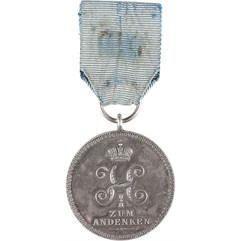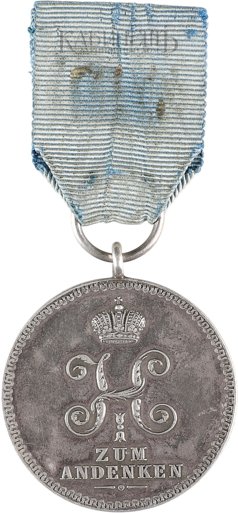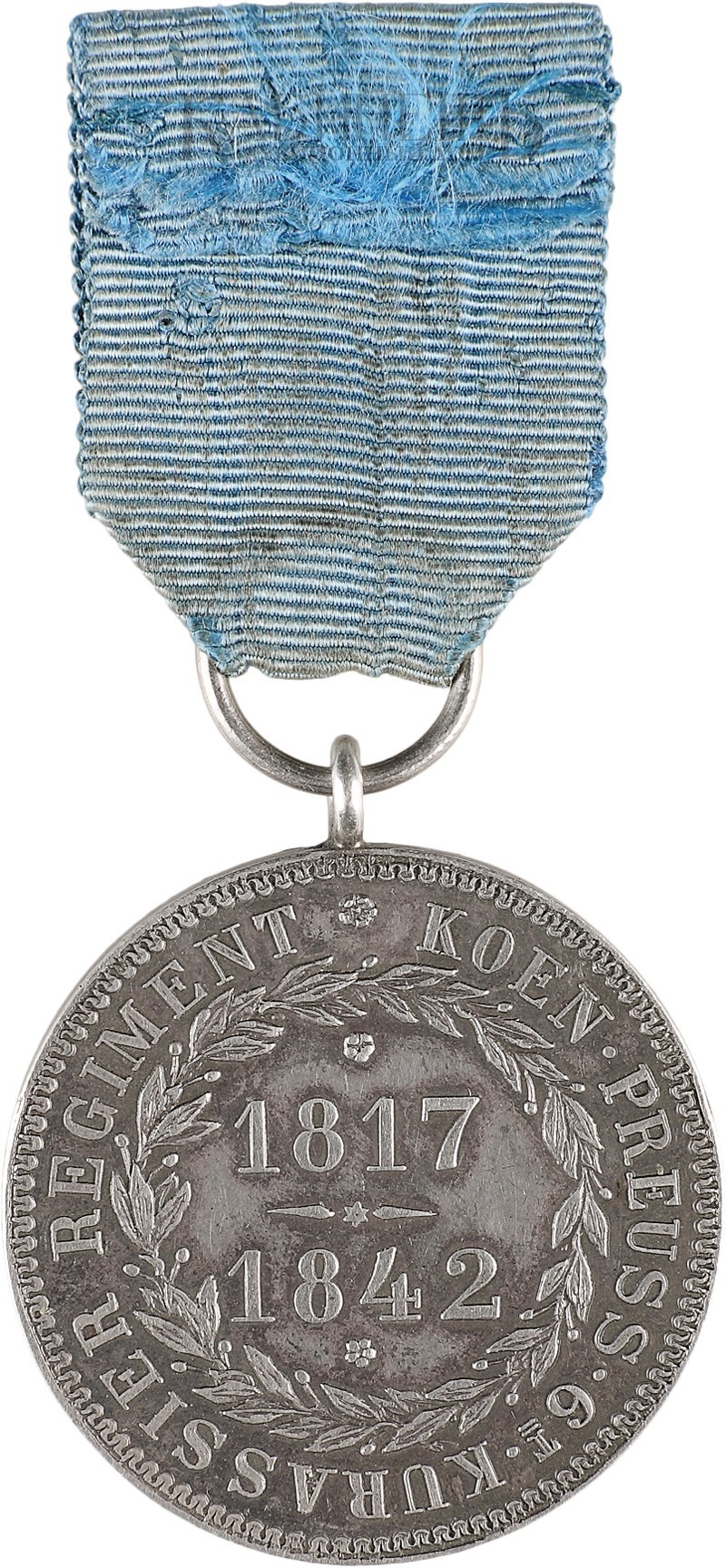 5/17 апреля 1817 г. Великий Князь Николай Павлович (впоследствии Император Николай I) был назначен шефом 3-го (с 1819 г. порядковый номер стал 6-м) Бранденбургского кирасирского полка Прусской армии. В 1842 г. праздновалось 25-летие со дня этого назначения, и была учреждена медаль для награждения офицеров и солдат полка. Прибывшие в С.-Петербург с поздравлениями члены делегации полка (6 человек) получили в память юбилея золотые медали с ушками для ношения на груди на Андреевской ленте. Для остальных чинов полка были пожалованы 24 золотые (для офицеров) и 700 серебряных (для солдат) медалей без ушка. Надписи: на лицевой стороне медали – «ZUM ANDENKEN» (На память), на оборотной стороне медали – «KOEN•PREUSS•6t•KURASSIER REGIMENT» (Короля Прусского 6-му кирасирскому полку)