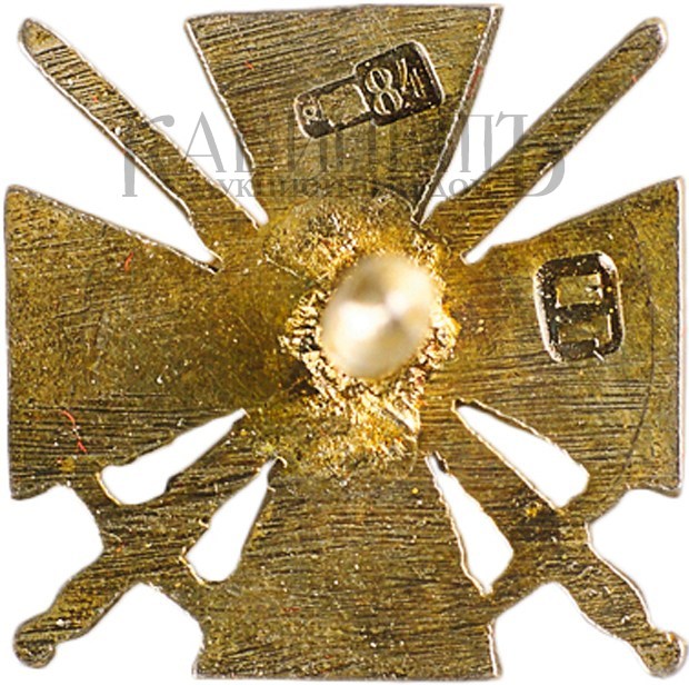 Клейма: на оборотной стороне – пробирное «84» Санкт-Петербургского окружного пробирного управления (с женской головкой в кокошнике, повернутой вправо с буквой «альфа») для маловесных изделий из драгоценных металлов; именник «ИТ». На закрутке – знак удостоверения.