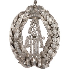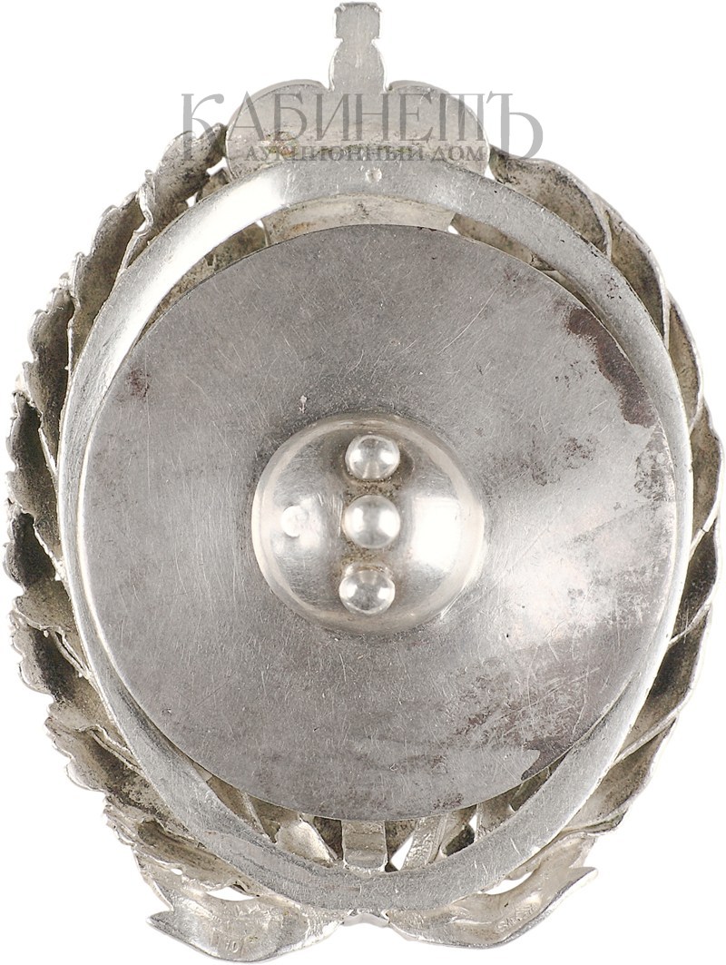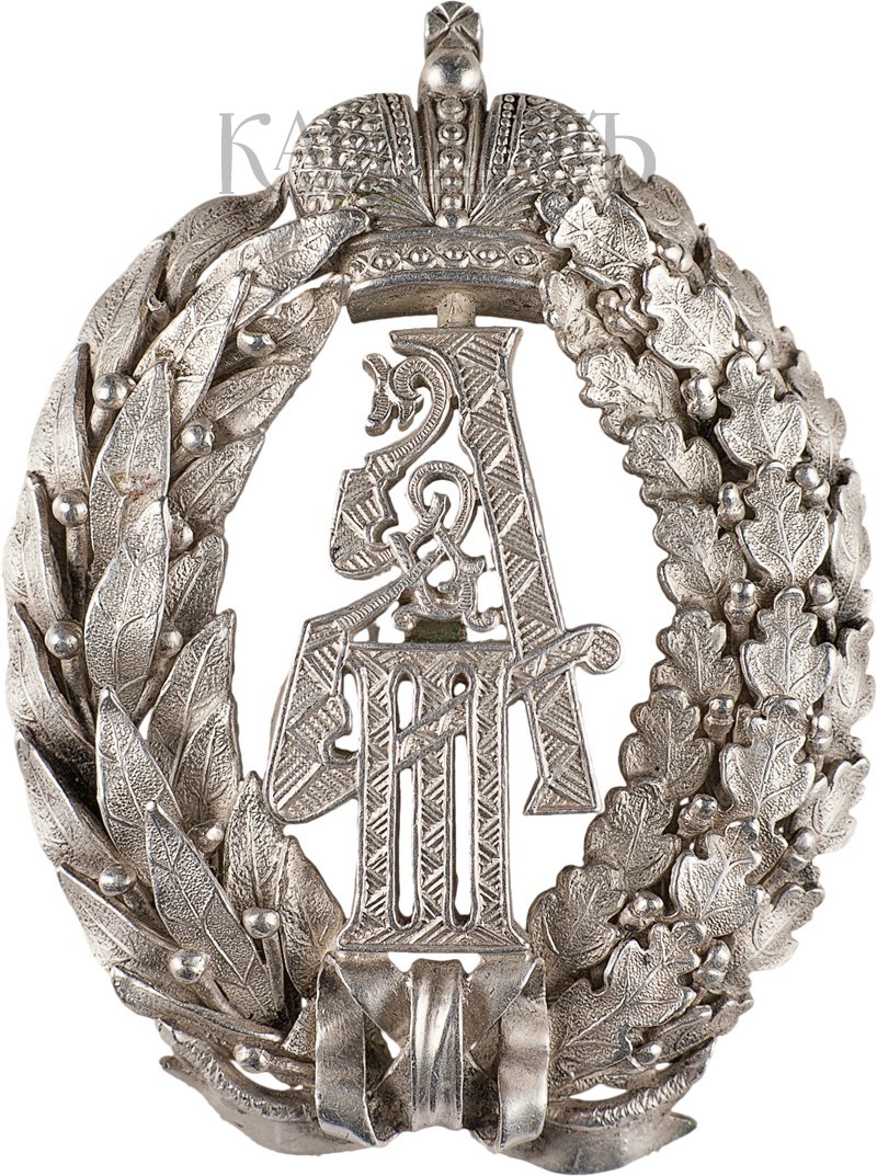 Клейма: на оборотной стороне, на венке – пробирное «84» Санкт-Петербургского окружного пробирного управления (с женской головкой в кокошнике, повернутой влево) и инициалами пробирного инспектора «АР»; именник «ДО». На вензеле императора с оборотной стороны знака – технологические (?) клейма «6», «2», «0».