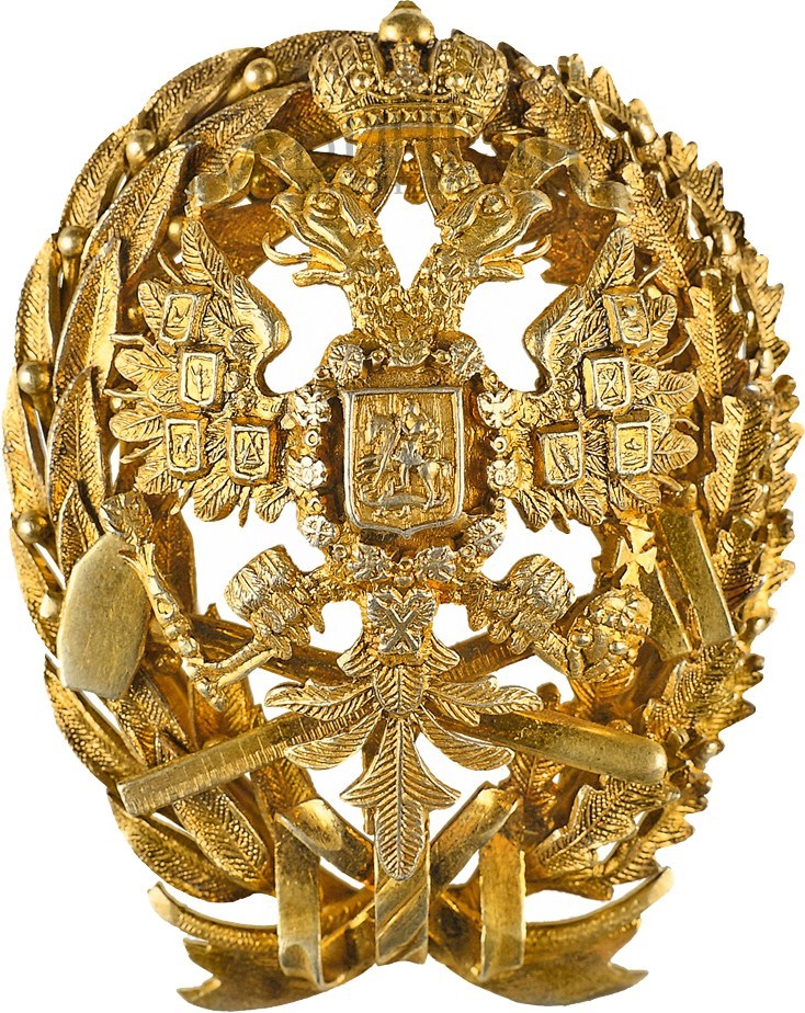 Клейма: на оборотной стороне на лентах венка – пробирное «84» Санкт-Петербургского окружного пробирного управления (с женской головкой в кокошнике, повернутой влево) и инициалами пробирного инспектора «ЯЛ» (Яков Ляпунов»); именник «НС». На закрутке и прижимной шайбе - знак удостоверения; именник «НС».