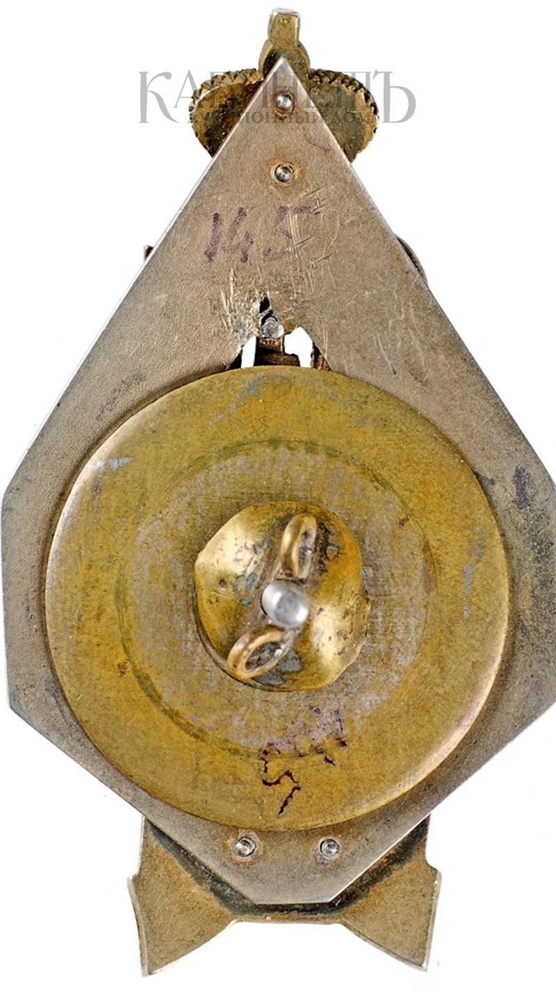 Размер 62,5 х 63 мм. Вес 31,65 г. Серебро, золото, эмаль.