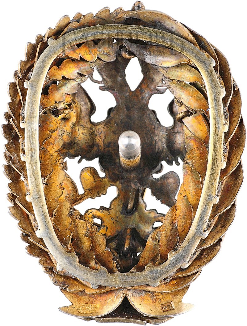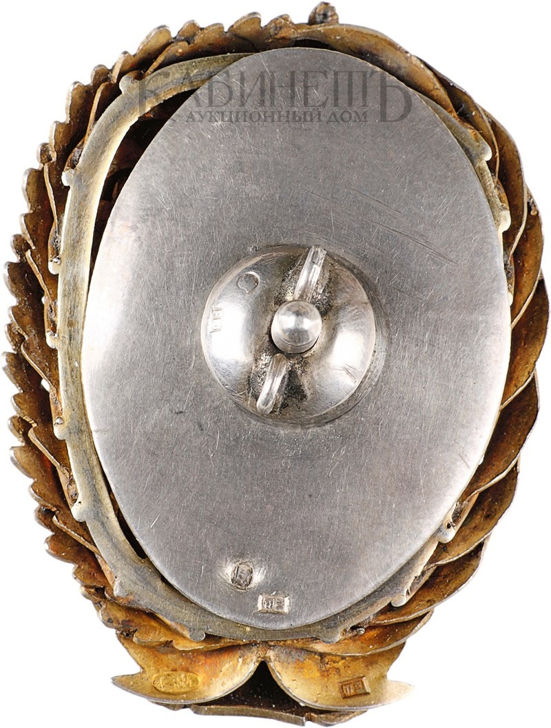 Клейма: на оборотной стороне – пробирное «84» Санкт-Петербургского окружного пробирного управления (с женской головкой в кокошнике, повернутой вправо и буквой «альфа»), именник «ЕШ». На закрутке и прижимной шайбе знак удостоверения; именник «ЕШ».