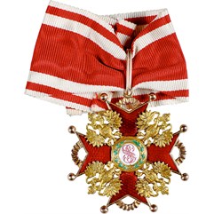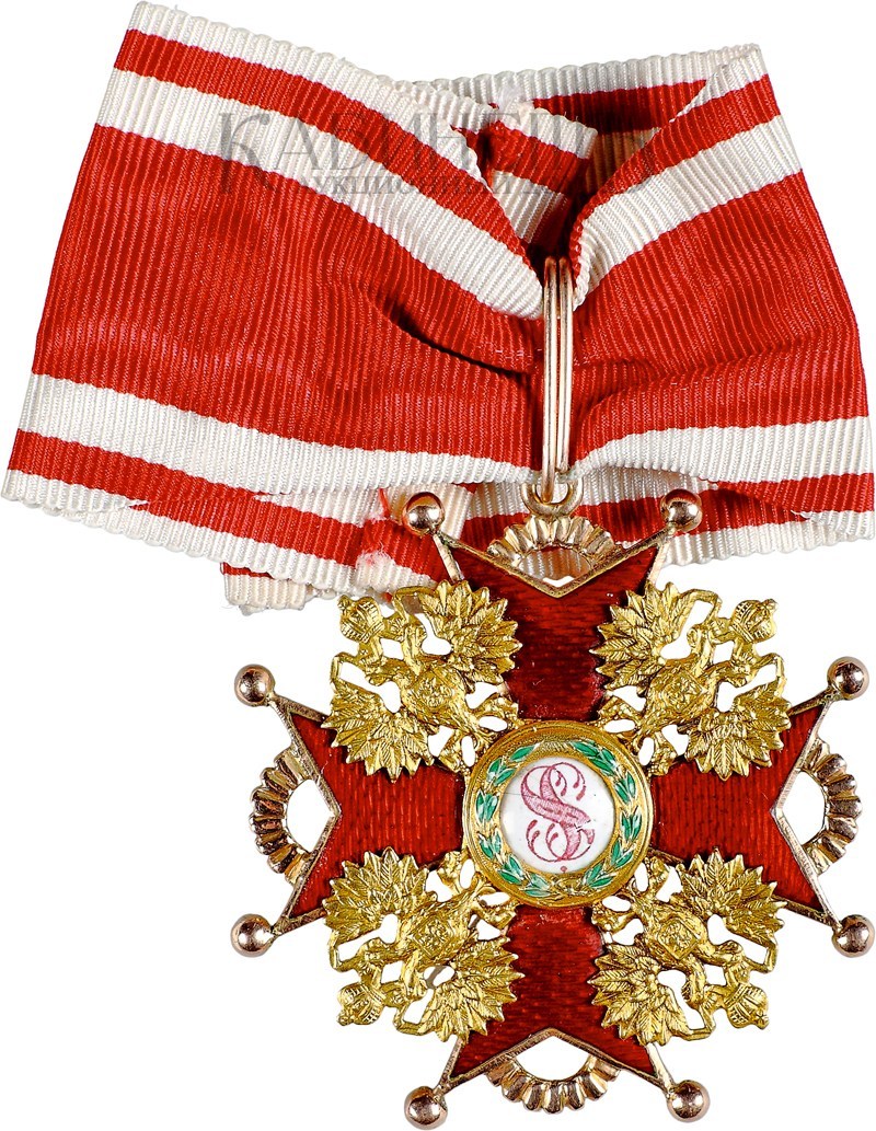 Клейма: на оборотной стороне на ушке – пробирное «56» Санкт-Петербургского окружного пробирного управления (с женской головкой в кокошнике, повернутой вправо); на верхнем луче – именник «ВД», на нижнем – развернутое клеймо «Эдуардъ»; два знака удостоверения на шариках лучей; два знака удостоверения на горизонтальных дужках лучей.