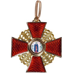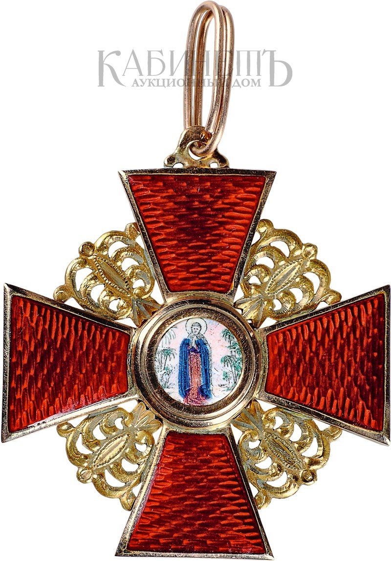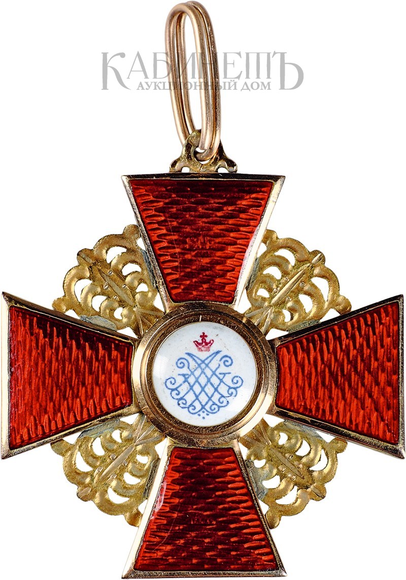 Клейма: на оборотной стороне на ушке – остатки пробирного клейма Санкт-Петербургского окружного пробирного управления; на верхнем луче – именник «ВД» под эмалью, на нижнем – развернутое клеймо фирмы «Эдуардъ».