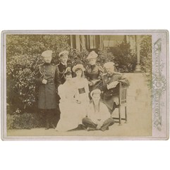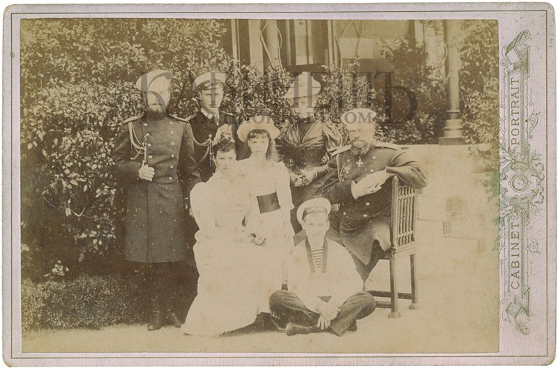 Считается, что это последняя фотография, на которой запечатлен император Александр III при жизни. Слева направо: цесаревич Николай Александрович, великий князь Георгий Александрович, импера- трица Мария Федоровна, великая княжна Ольга Александровна, великий князь Михаил Александро- вич, великая княжна Ксения Александровна, император Александр III.