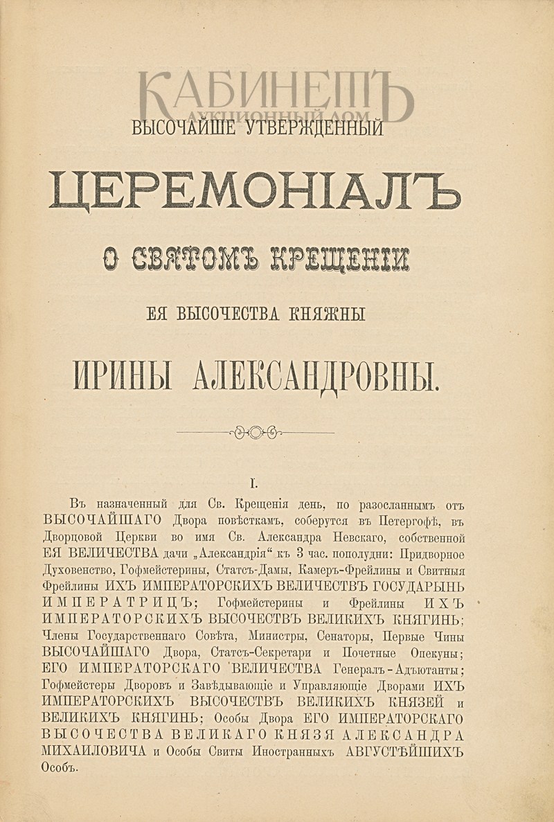 Ирина Александровна (1895–1970) – княжна императорской крови, дочь великого князя Александра Михайловича и великой княгини Ксении Александровны. Внучка императора Александра III по материнской линии и правнучка императора Николая I по отцовской. С 1914 г. – супруга князя Феликса Феликсовича Юсупова (1887–1967). После убийства Г.Е. Распутина в 1916 г. выслана вместе с мужем в имение Ракитное в Курской губернии. В 1919 г. вместе с мужем и членами семьи Романовых была эвакуирована из Крыма на английском военном корабле в Великобританию. Затем переехала во Францию.