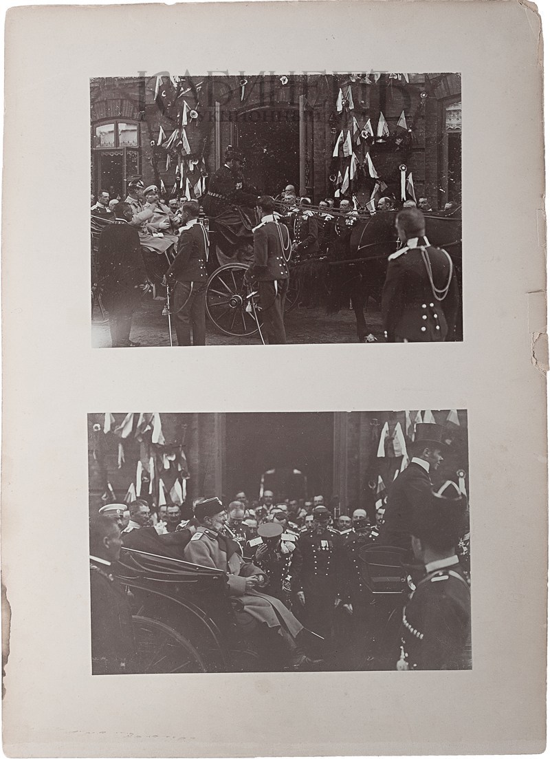 1. Офицеры лейб-гвардии Уланского Ее Величества полка приветствуют великого князя Михаи ла Александровича и герцога Александра Петровича Ольденбургского, прибывших на торжеств по случаю 100-летнего юбилея полка