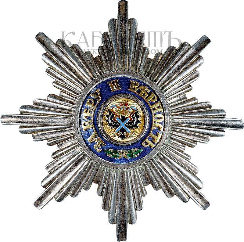 Орден Святого Апостола Андрея Первозванного – высший орден Российской империи, учрежденный императором Петром I 30 ноября 1698 г. Орденом награждались русские великие князья при рождении, члены императорской фамилии по достижении ими совершеннолетия, главы зарубежных государств и члены правящих династий Европы и Азии, а также выдающиеся военачальники, иерархи церквей. Кавалеры ордена должны были иметь княжеский или графский титул, звание сенатора, министра или посла, либо генеральский или адмиральский чин, а также достаточное состояние, чтобы «важность сего события поддержать».