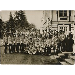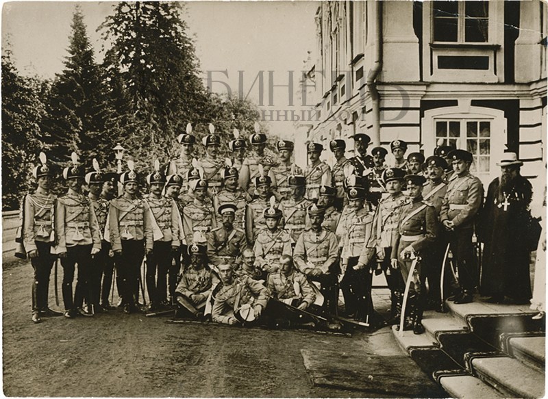 Император Николай II, великая княжна Ольга Николаевна и командир 3-го гусарского Елизаветградского великой княжны Ольги Николаевны полка полковник А.И.Мартынов (справа от Ольги Николаевны) среди офицеров полка в Петергофе