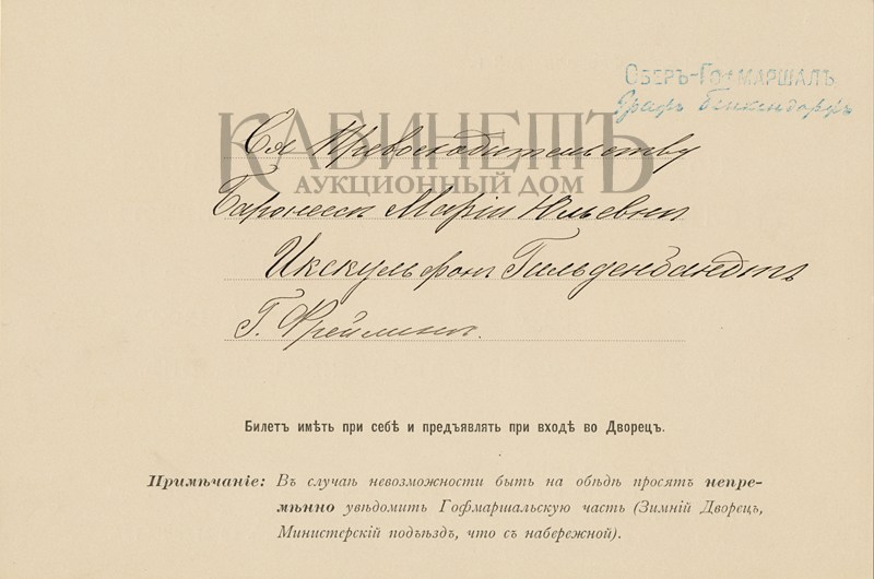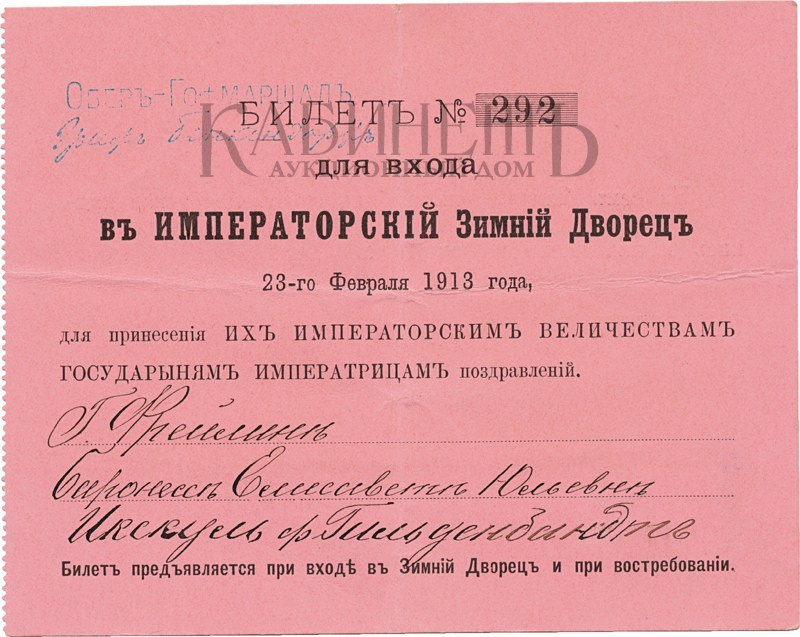 4. Билет № 292 для входа в Императорский Зимний Дворец 23-го февраля 1913 года, для принесения Их Императорским Величествам Государыням Императрицам поздравлений на имя фрейлины баро- нессы Елизаветы Юльевны Икскуль фон Гильденбандт