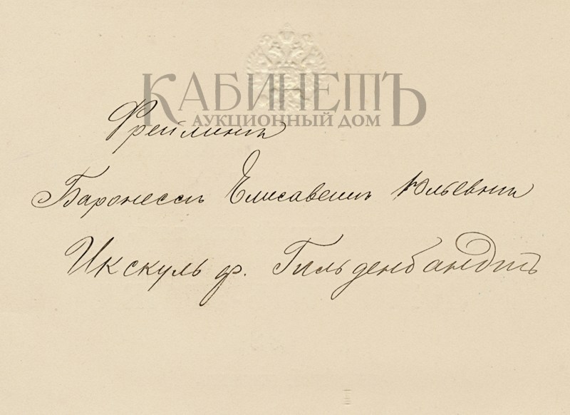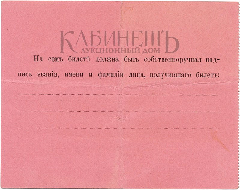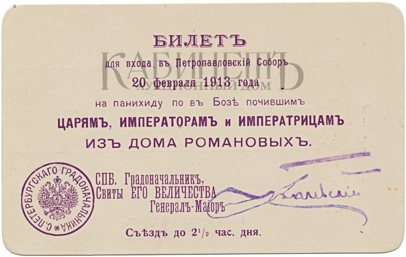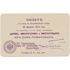 1. Билет № 1148 для входа в Петропавловский собор 20 февраля 1913 года на панихиду по в Бозе почившим царям, императорам и императрицам из Дома Романовых на имя фрейлины баронессы Елизаветы Юльевны Икскуль фон Гильденбандт