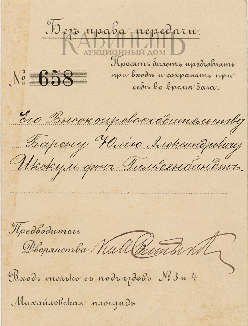 5. Билет № 658 на бал [23 февраля 1913 года] в Дворянском собрании Санкт-Петербурга на имя баро- на Юлия Александровича Икскуль фон Гильденбандта