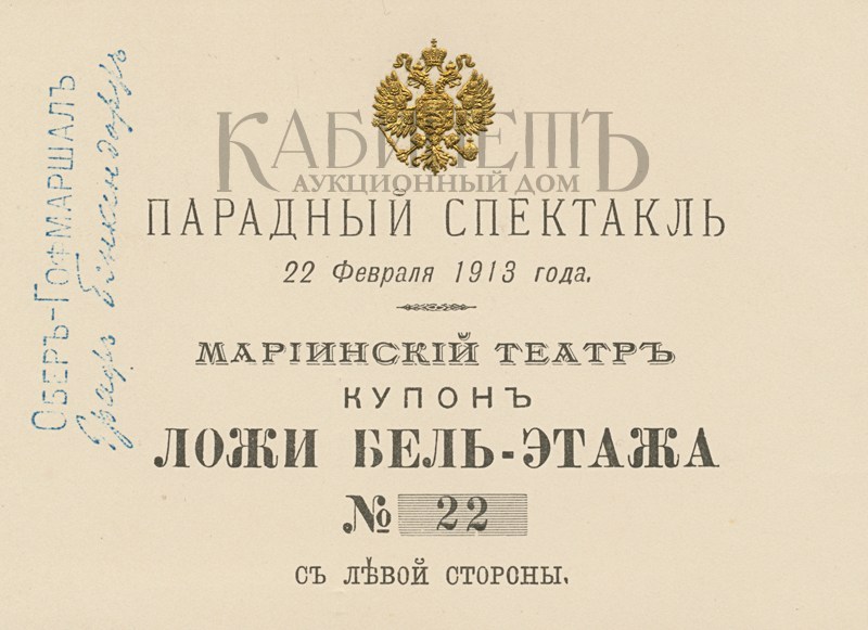 3. Билет № 22 на парадный спектакль 22 февраля 1913 г. в Мариинский театр на имя фрейлины баро- нессы Елизаветы Юльевны Икскуль фон Гильденбандт