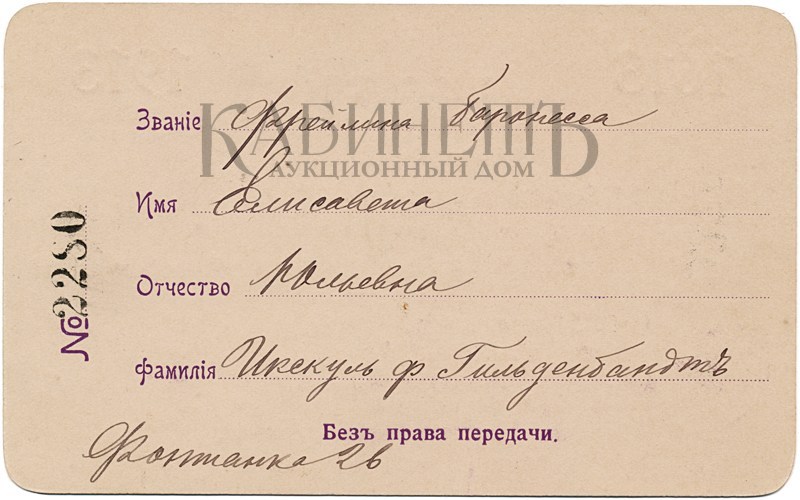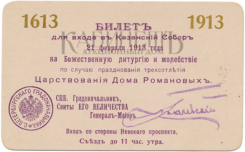 2. Билет № 2280 для входа в Казанский собор 21 февраля 1913 года на Божественную литургию и молебствие по случаю празднования трехсотлетия Царствования Дома Романовых на имя фрейлины баронессы Елизаветы Юльевны Икскуль фон Гильденбандт