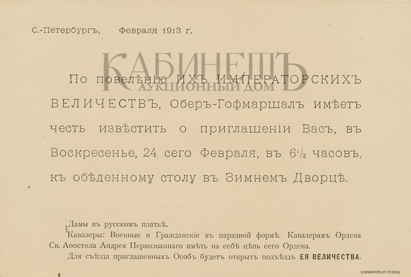 6. Пригласительный билет на торжественный обед 24 февраля 1913 года по случаю 300-летия царствования Дома Романовых на имя баронессы Марии Юльевны Икскуль фон Гильденбандт