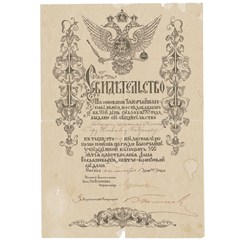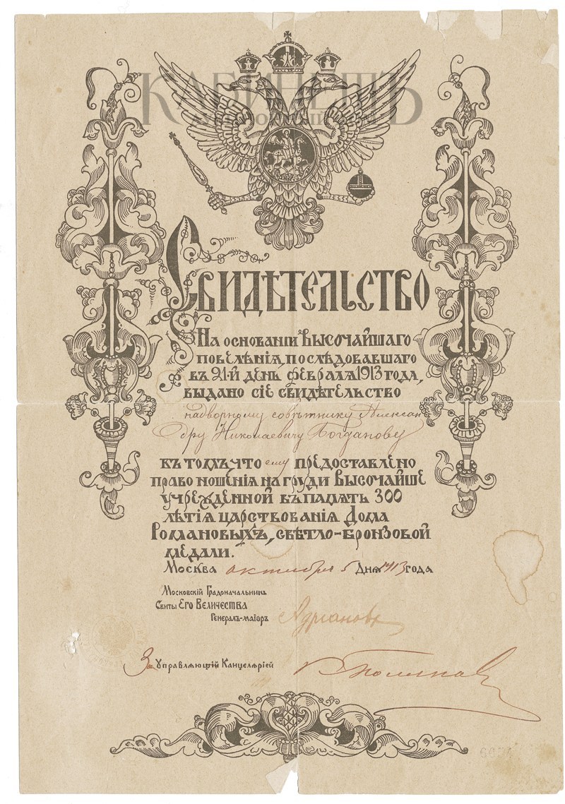 Свидетельство на имя надворного советника Александра Николаевича Богданова о предоставлении права ношения медали «В память 300-летия царствования Дома Романовых» от 5 октября 1913 г. за подписью московского Градоначальника Свиты Его Величества генерал-майора А.А. Адрианова.