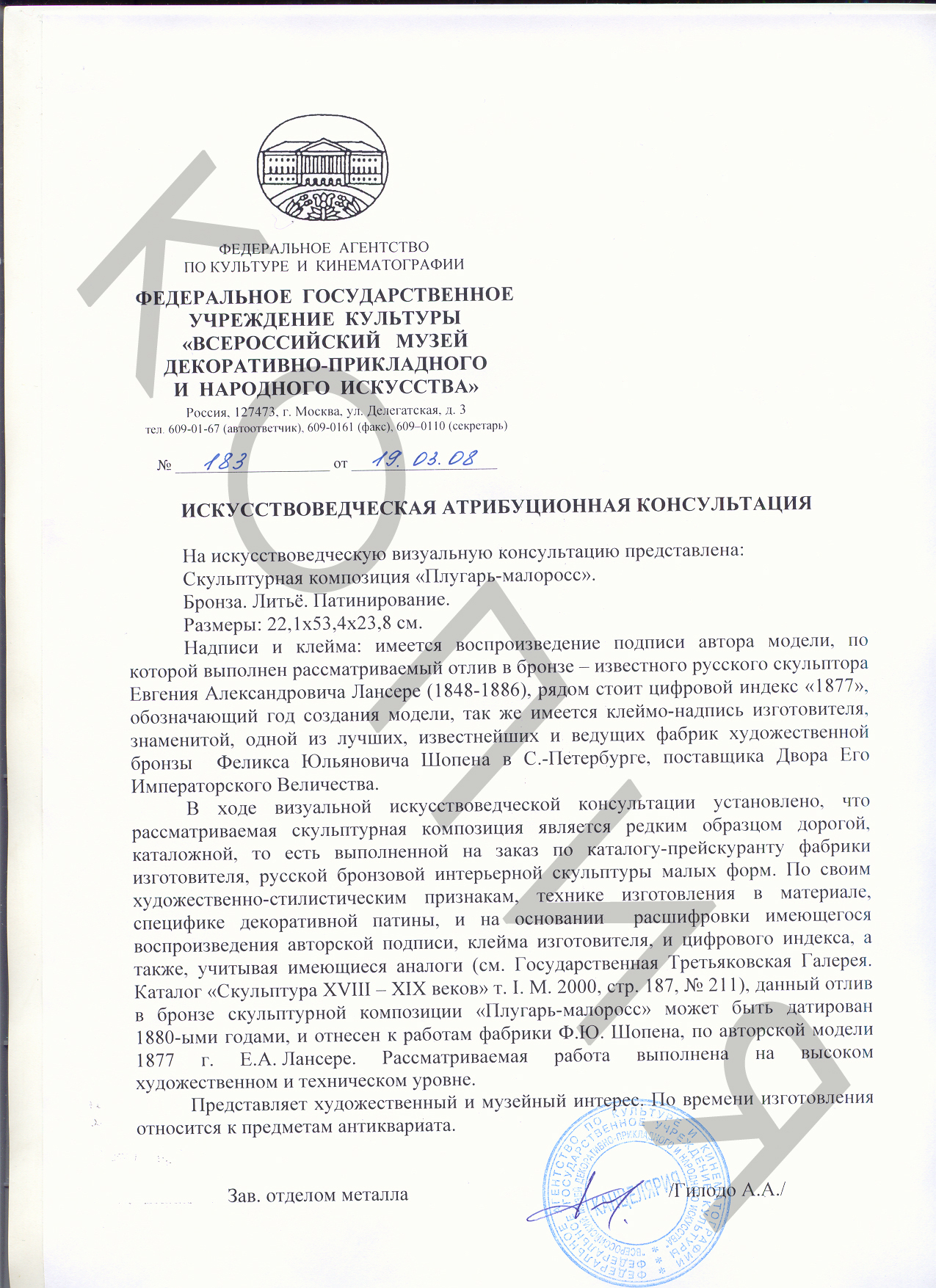 На поземе в литье воспроизведение подписи автора и год создания модели: "Е.ЛАНСЕРЕ: 1877". Ниже клемо фабрики изготовителя: "Ф. ШОПЕНЪ". Также имеется круглый штамп от Министерства финансов: "ОТЪ М.Ф. НА. 10 ЛЪТЪ. / 1877".